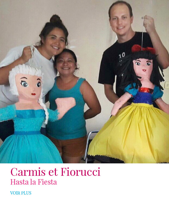 Nous avons développé notre savoir-faire auprès des grands artisans de la pinata, au Mexique. Carmis et Fiorucci vous proposent différents types de piñatas de tous les personnages imaginables pour tous vos évènements : anniversaires pour les petits et les grands, Noël, soirées coquines, même la fête des morts deviendra amusante. Et si vous souhaitez une piñata hors du commun on la créera pour vous dans notre atelier artisanal. 100% MADE IN FRANCE – 100% MEXICAIN. »
